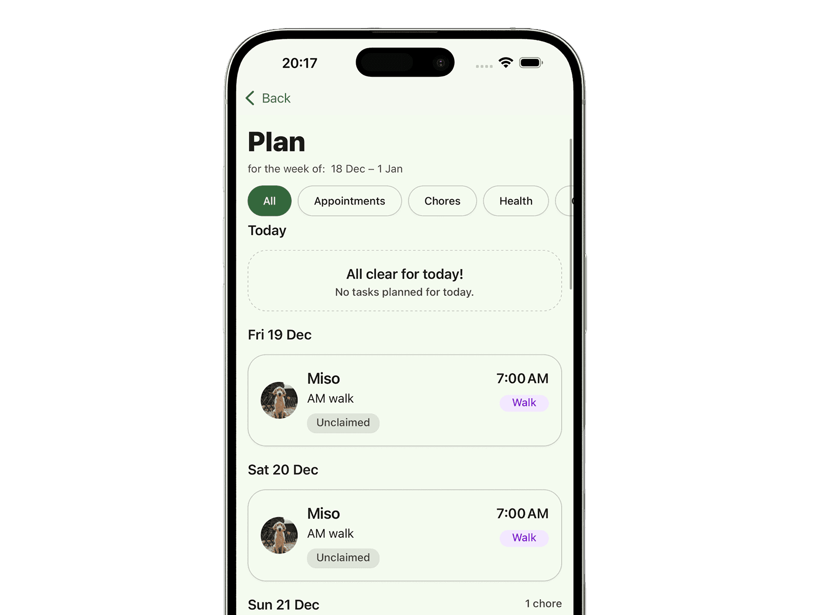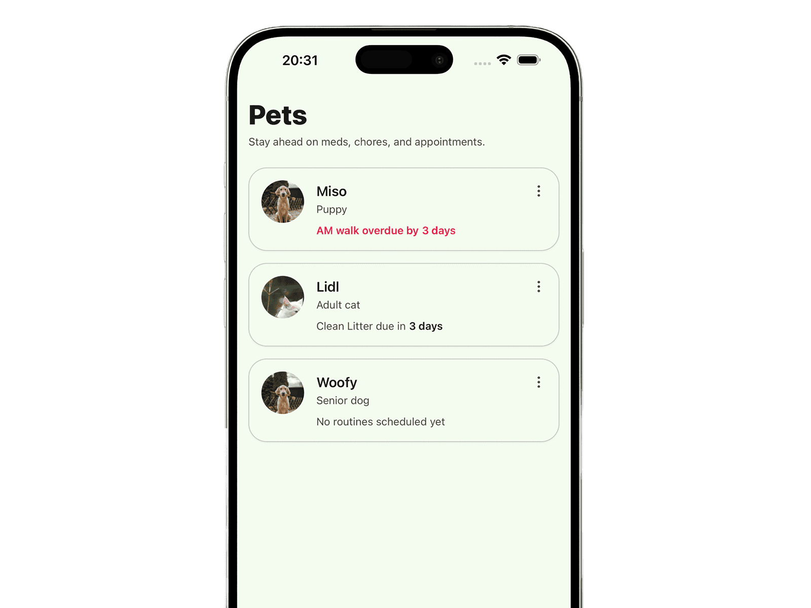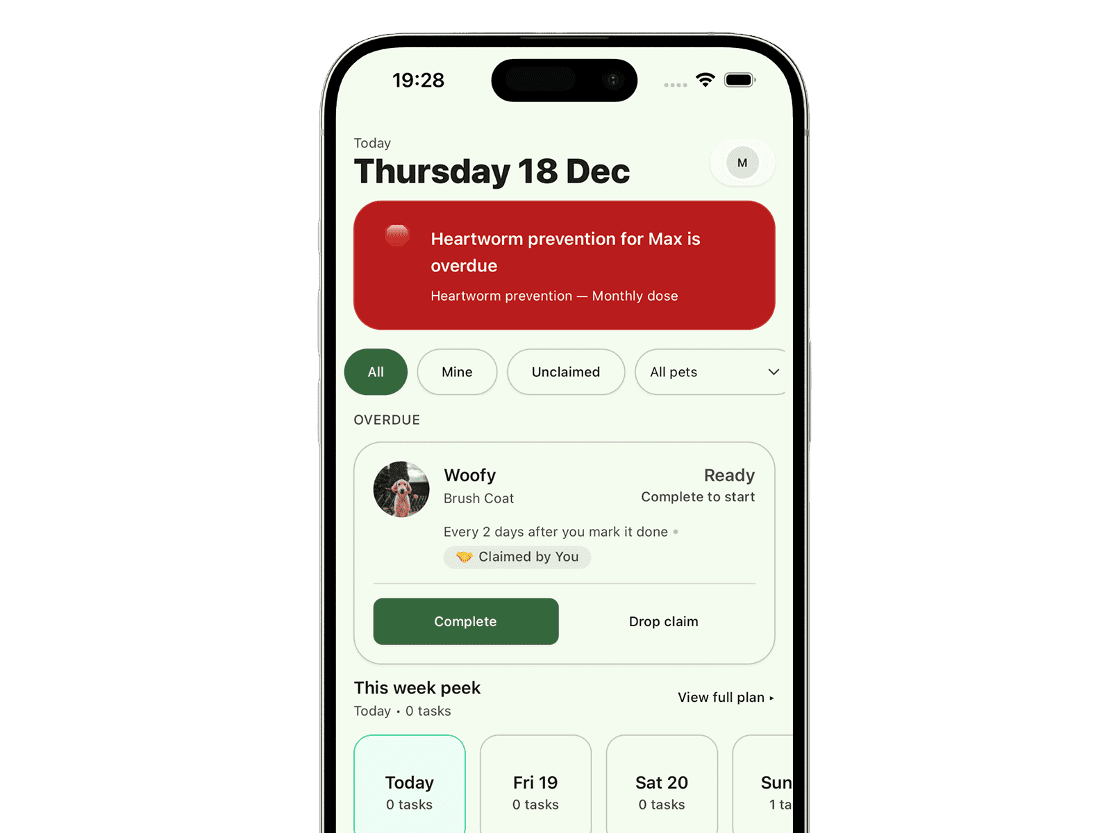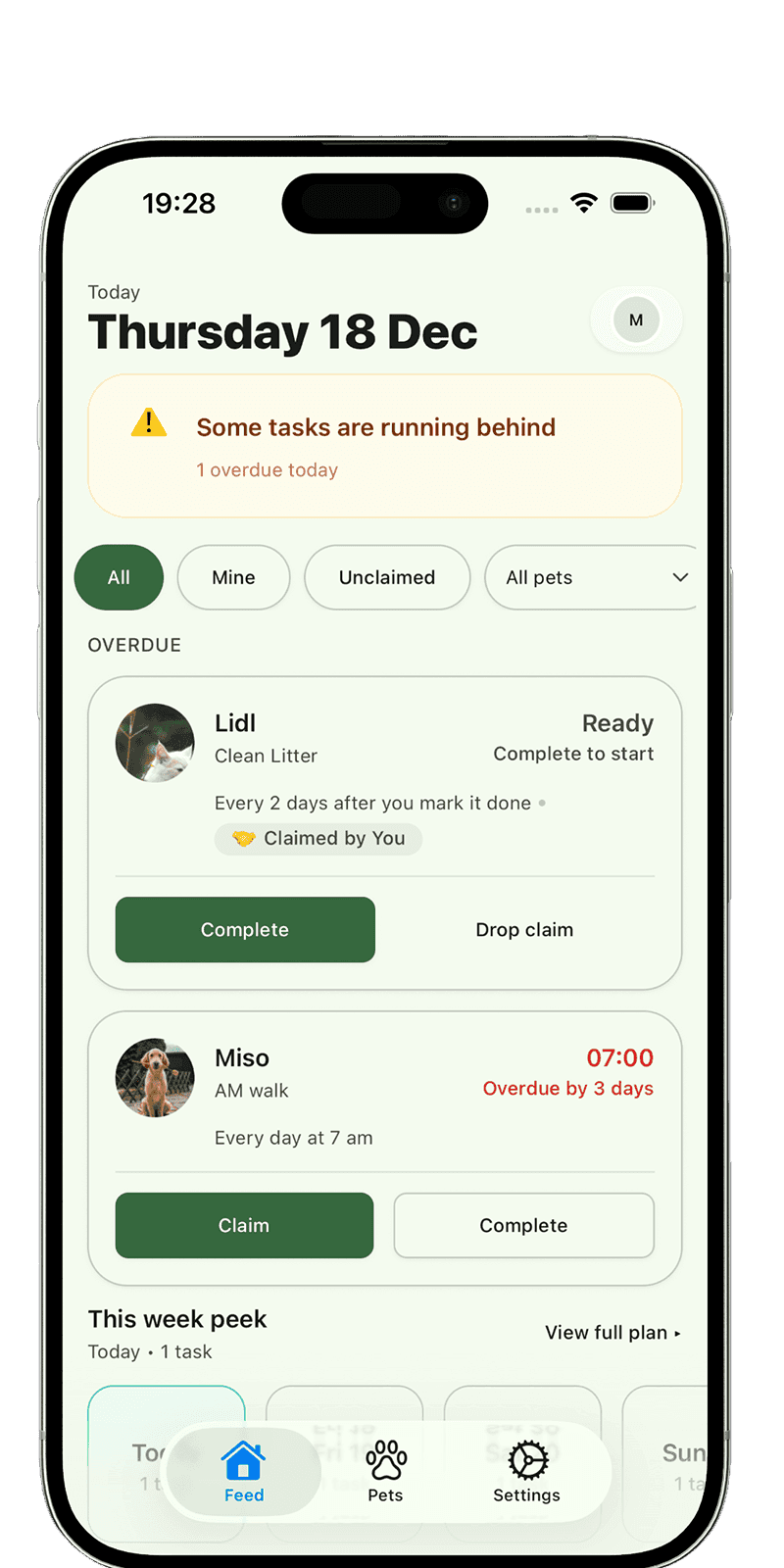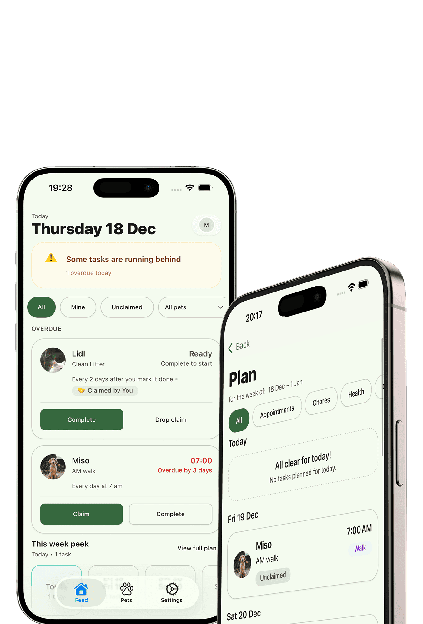 A shared pet-care schedule for busy households — so everyone knows what’s due, who’s done it, and what’s coming next.