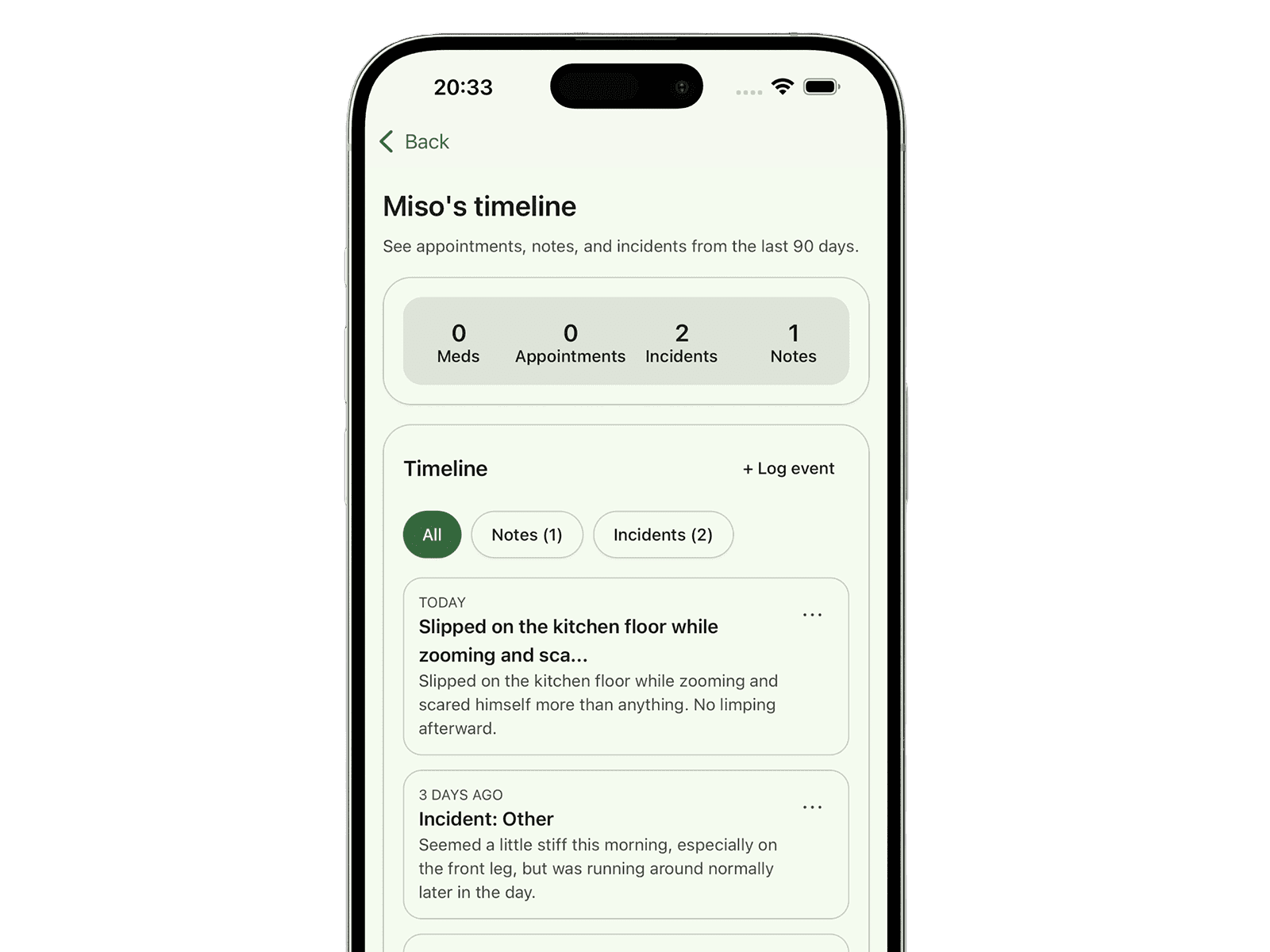 Quickly see recent meds, checkups, and incidents in one view. No scrolling through photos or guessing dates before an appointment.